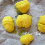 1. Излупениот компир се сече на кришки, се премачкува со маслиново масло и се става на хартија врз плех за печење, но не целосно отворени.